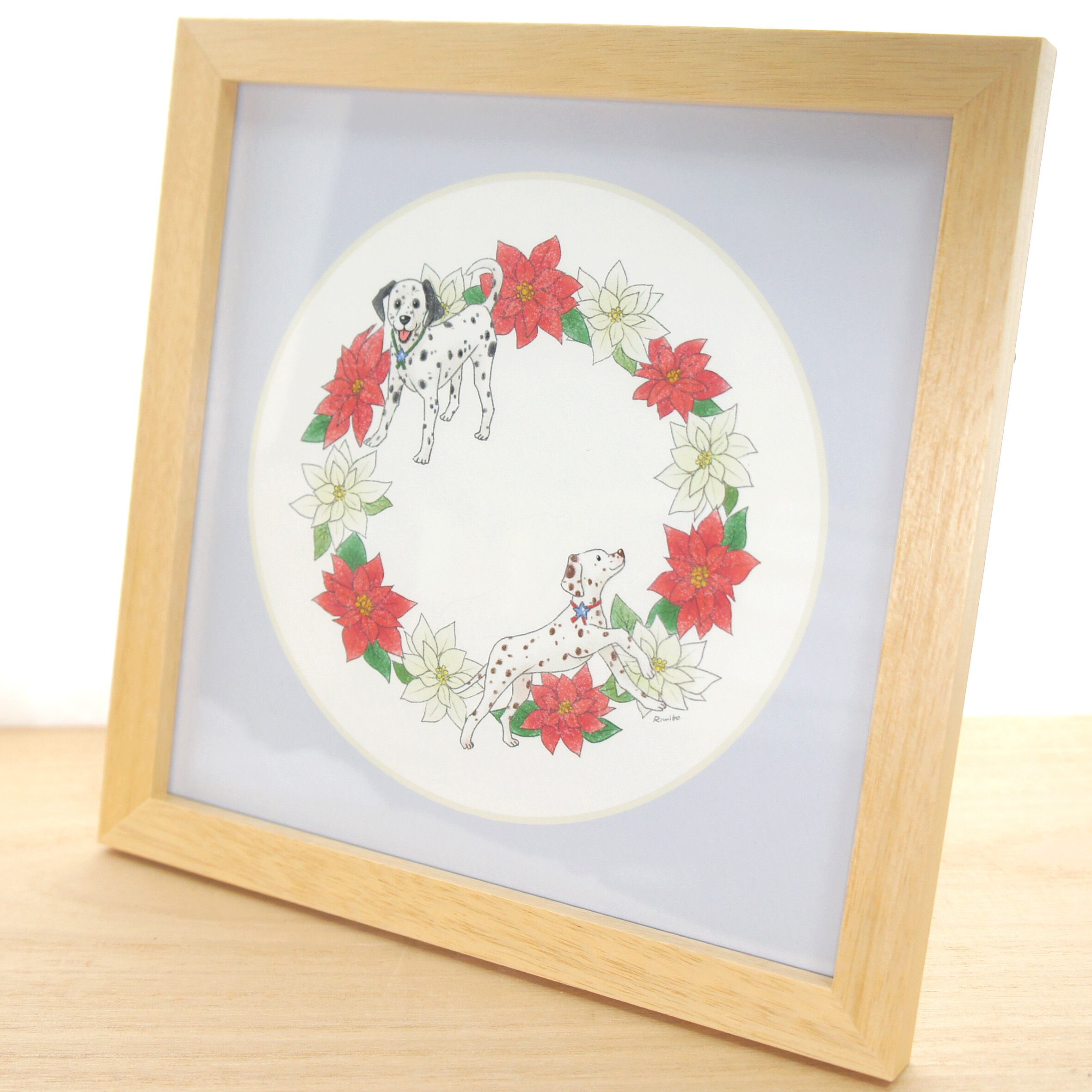 愛らしいダルメシアンが鮮やかなポインセチアに囲まれた、少しクリスマスの雰囲気を感じる作品です。